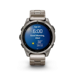 Garmin Fenix 8 получили сенсорный экран и диагональю 1,3 дюйма с разрешением 416х416 точек. AMOLED матрица передает картинку в высокой яркости и контрастности, изображение хорошо видно даже под углом. Экран защищен стеклом Power Sapphire, устойчивым к царапинам. Дисплей может отображать время в аналоговом и цифровом формате.