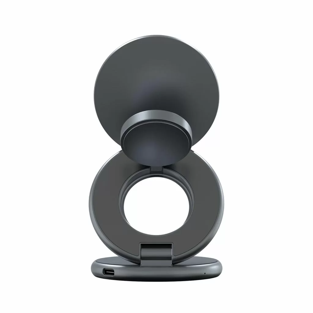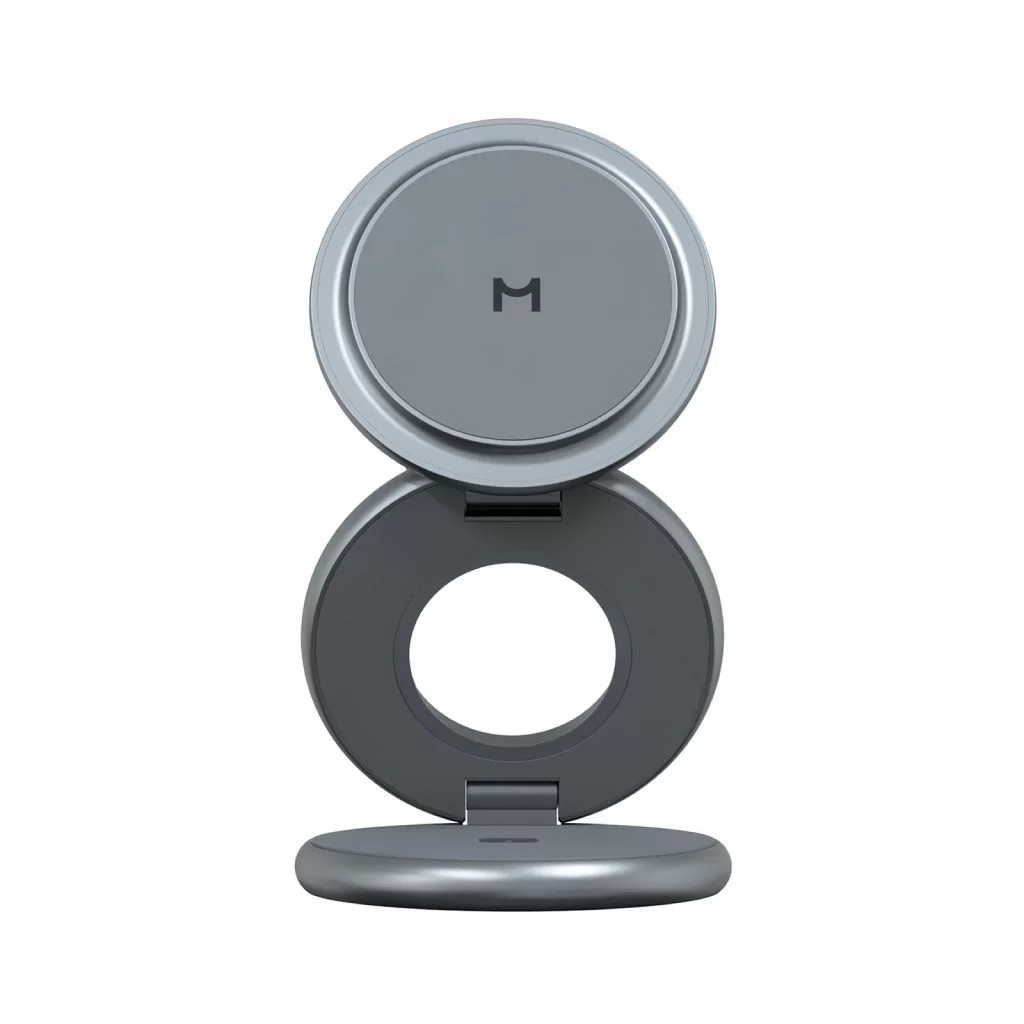 Корпус выполнен из прочного цинкового сплава с матовым покрытием и встроенными магнитами класса N52, которые надёжно удерживают устройства. Конструкция складывается в три сегмента, что делает зарядку максимально компактной и удобной в дороге. В комплекте предусмотрен кожаный кейс, идеально подходящий для переноски и защиты.