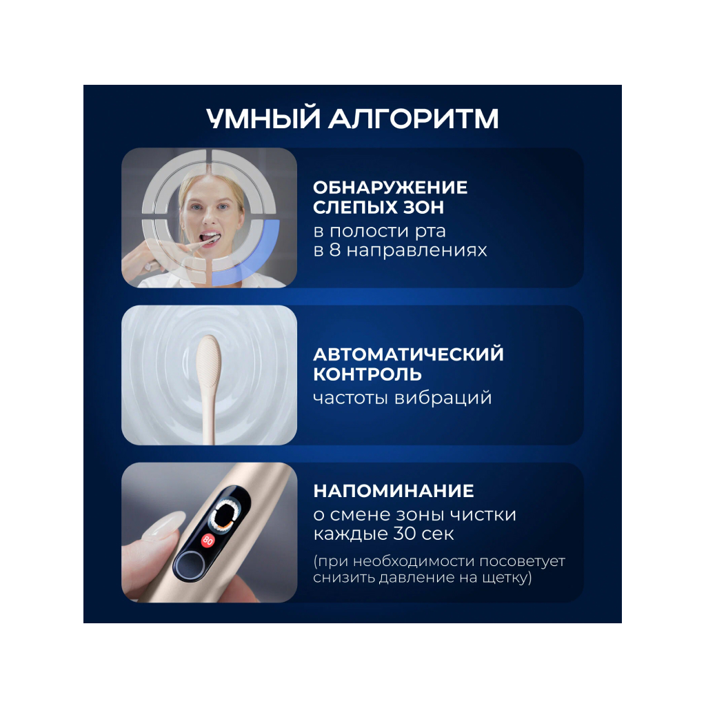 Определяет и контролирует все основные зоны полости рта. Напоминает о необходимости менять зону чистки каждые 30 секунд. Она также предоставляет автоматически сгенерированный план чистки зубов, если ваш показатель чистки зубов ниже 90.